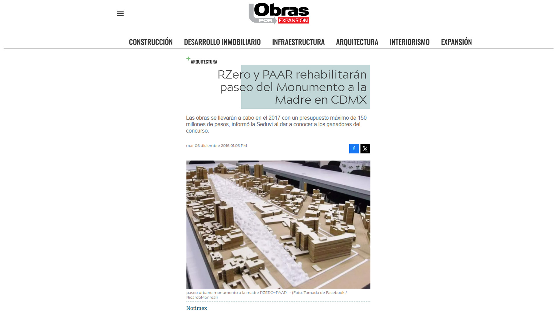 Hoy se anunció el proyecto ganador del Concurso Paseo Urbano Monumento a la Madre, organizado por la Secretaría de Desarrollo Urbano y Vivienda, y la Delegación Cuauhtémoc. Según el acta del jurado y de acuerdo a las bases enunciadas en la convocatoria y a los lineamientos entregados a los concursantes, habiendo considerado a su vez las observaciones de los vecinos, el Jurado tuvo a bien otorgar el primer lugar al grupo Rzero + PAAR.